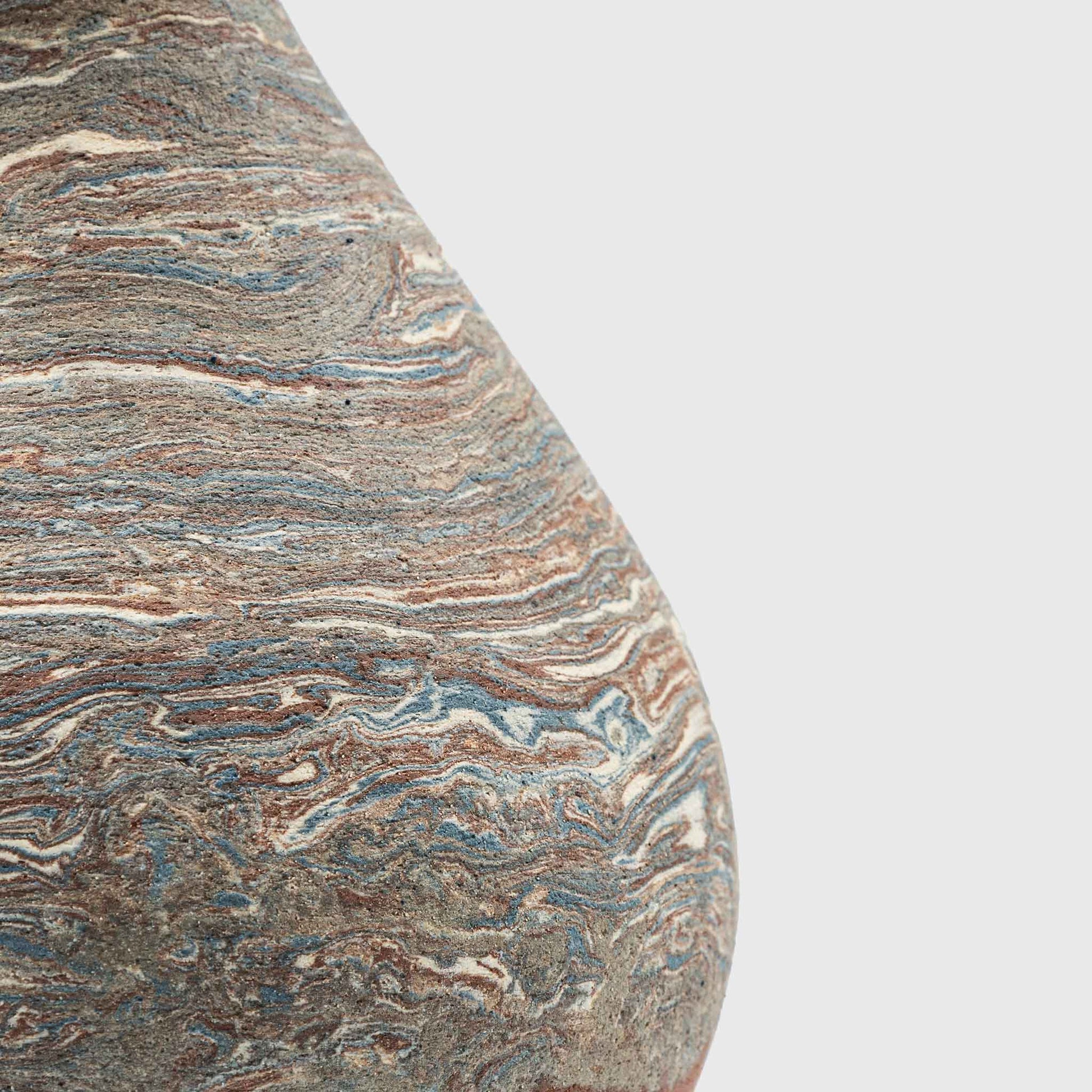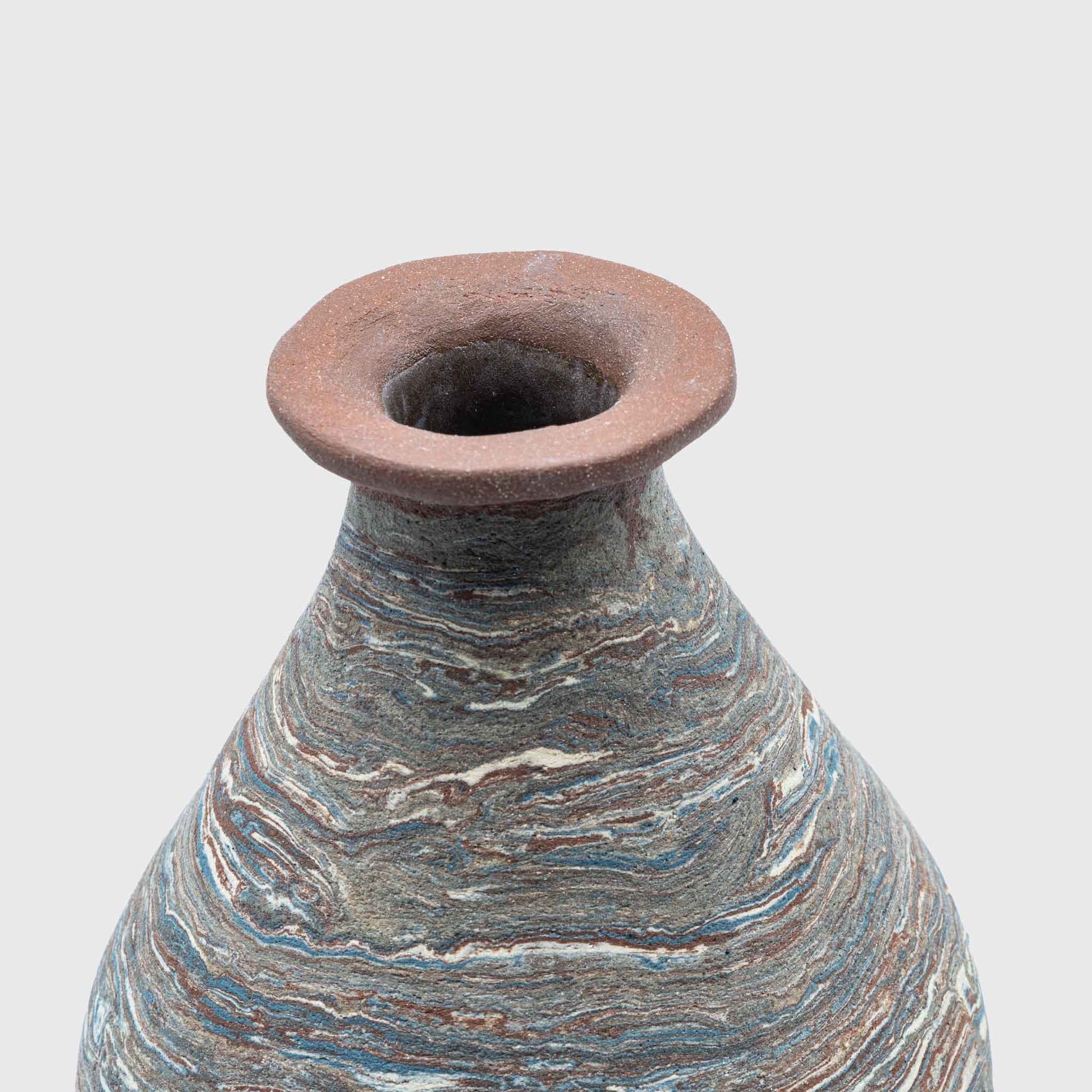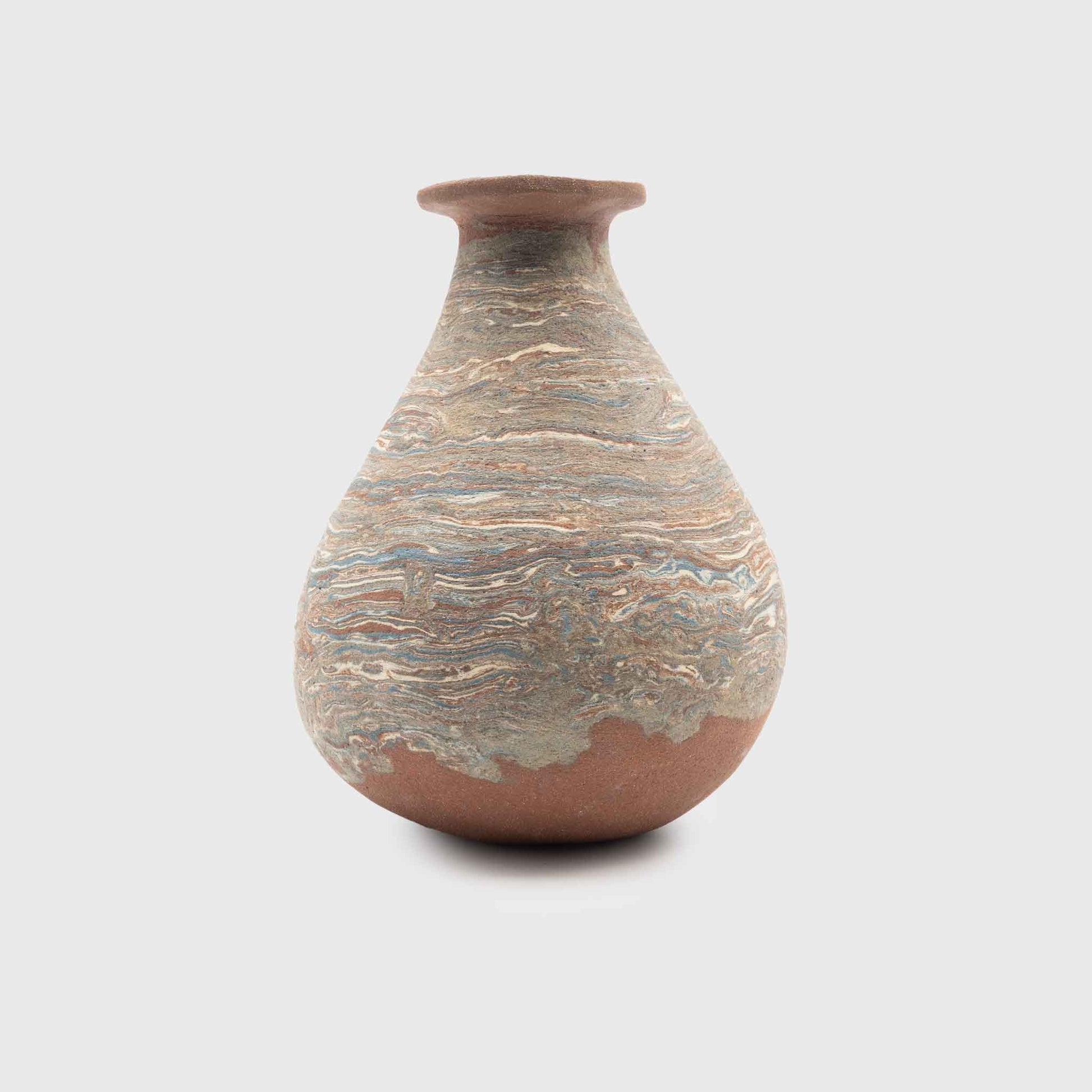This small vessel in the shape of a drop is made out of a mixture of burdundy, blue and white clay bodies wedged together to create this unique look. Clear glaze inside to hold liquids.