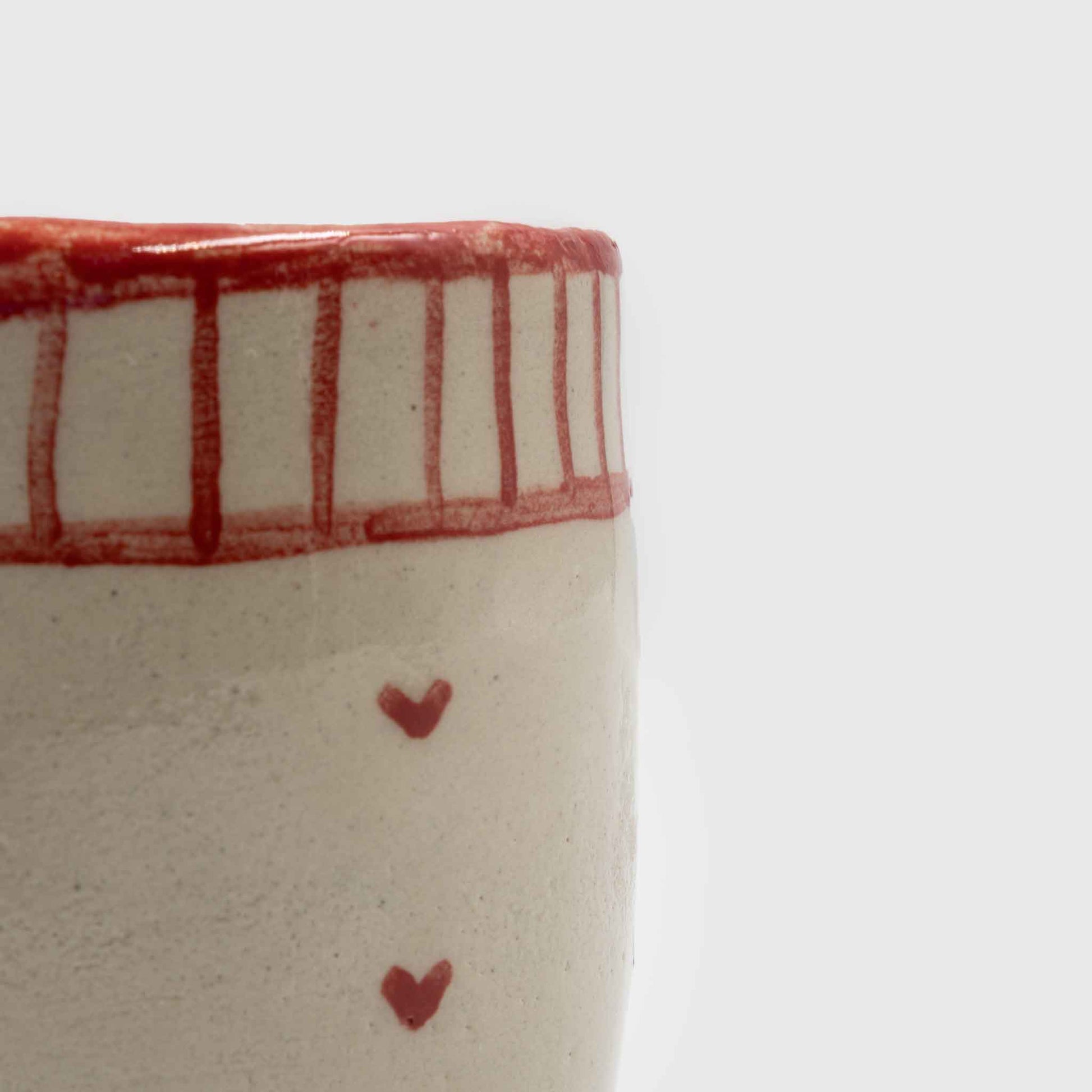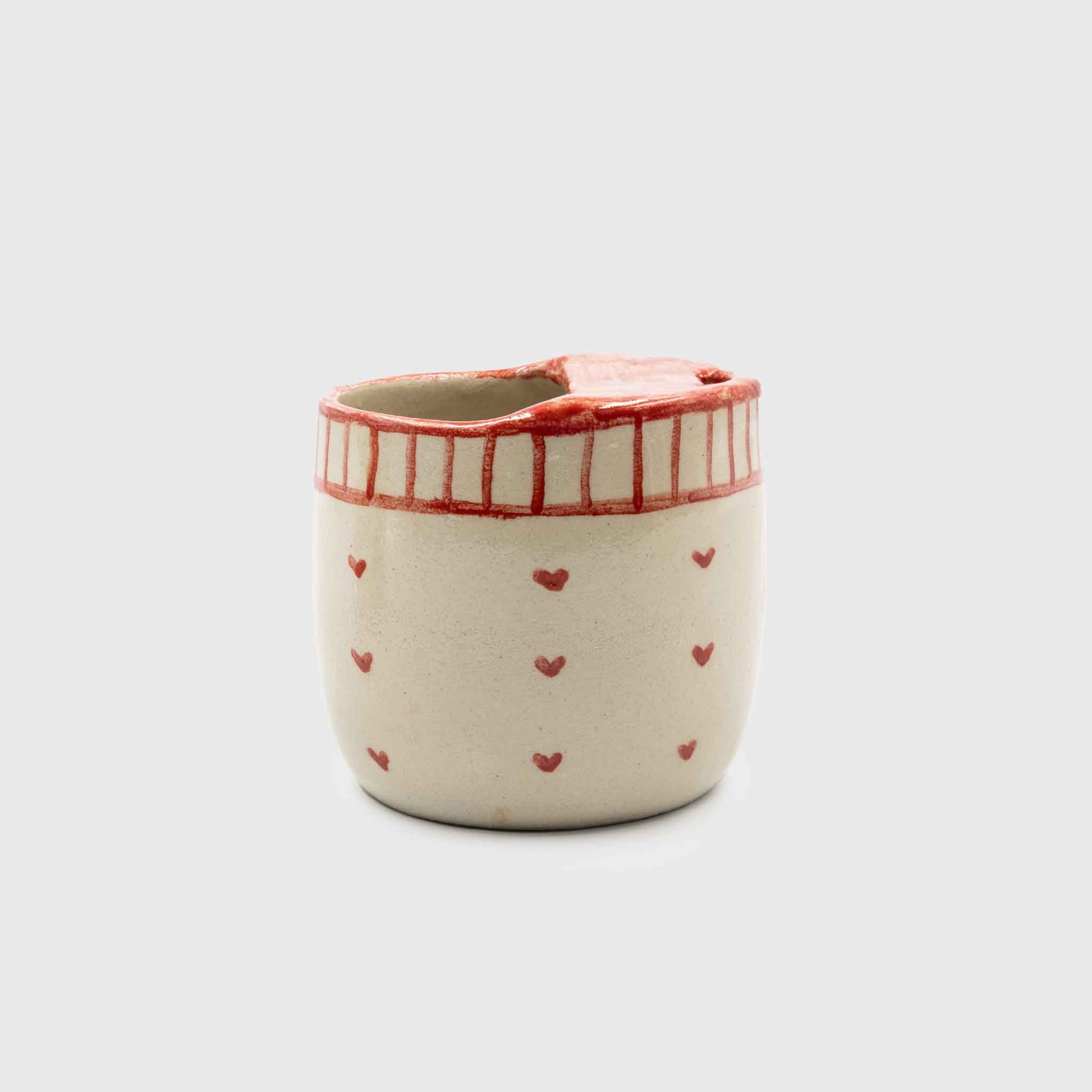 Handmade, ceramic sip cup (covered mug with spout) decorated with small, discreet hearts, radiating English cottage vibes. Made from high-temperature clay at 1250°, it came to accompany us at all times.