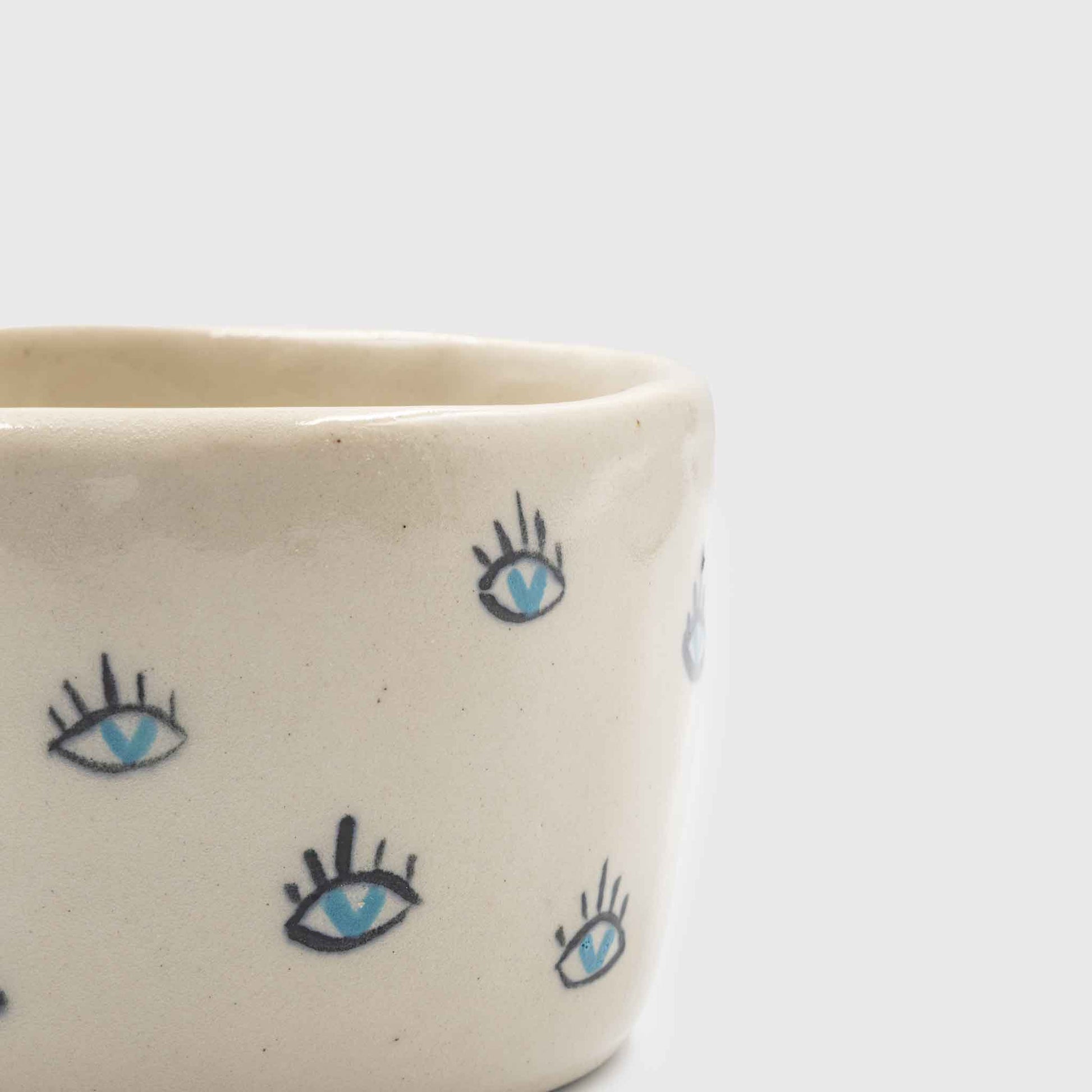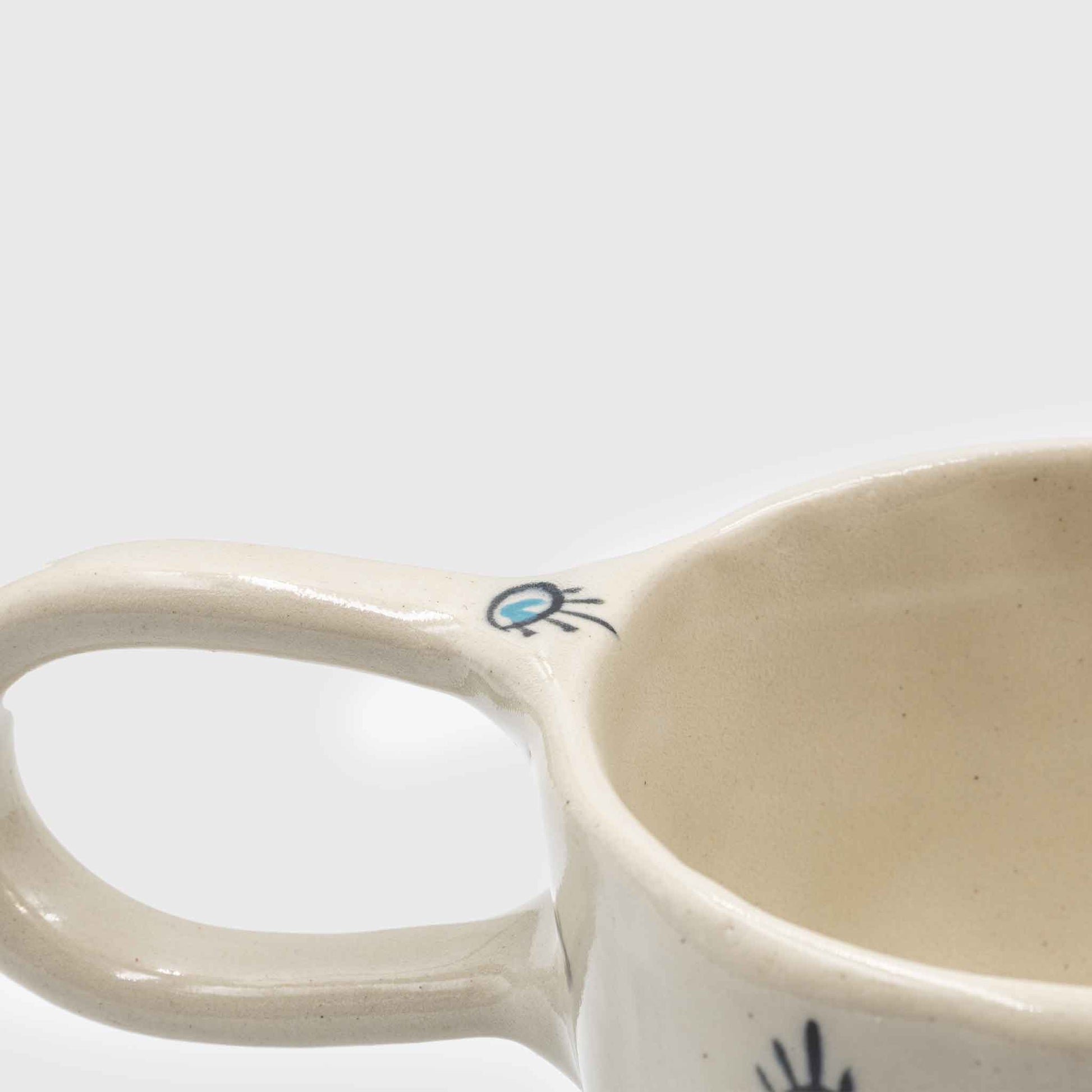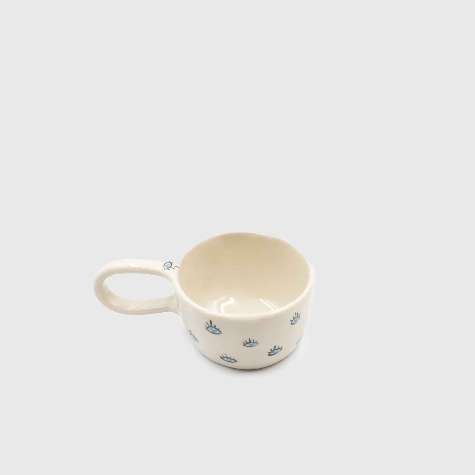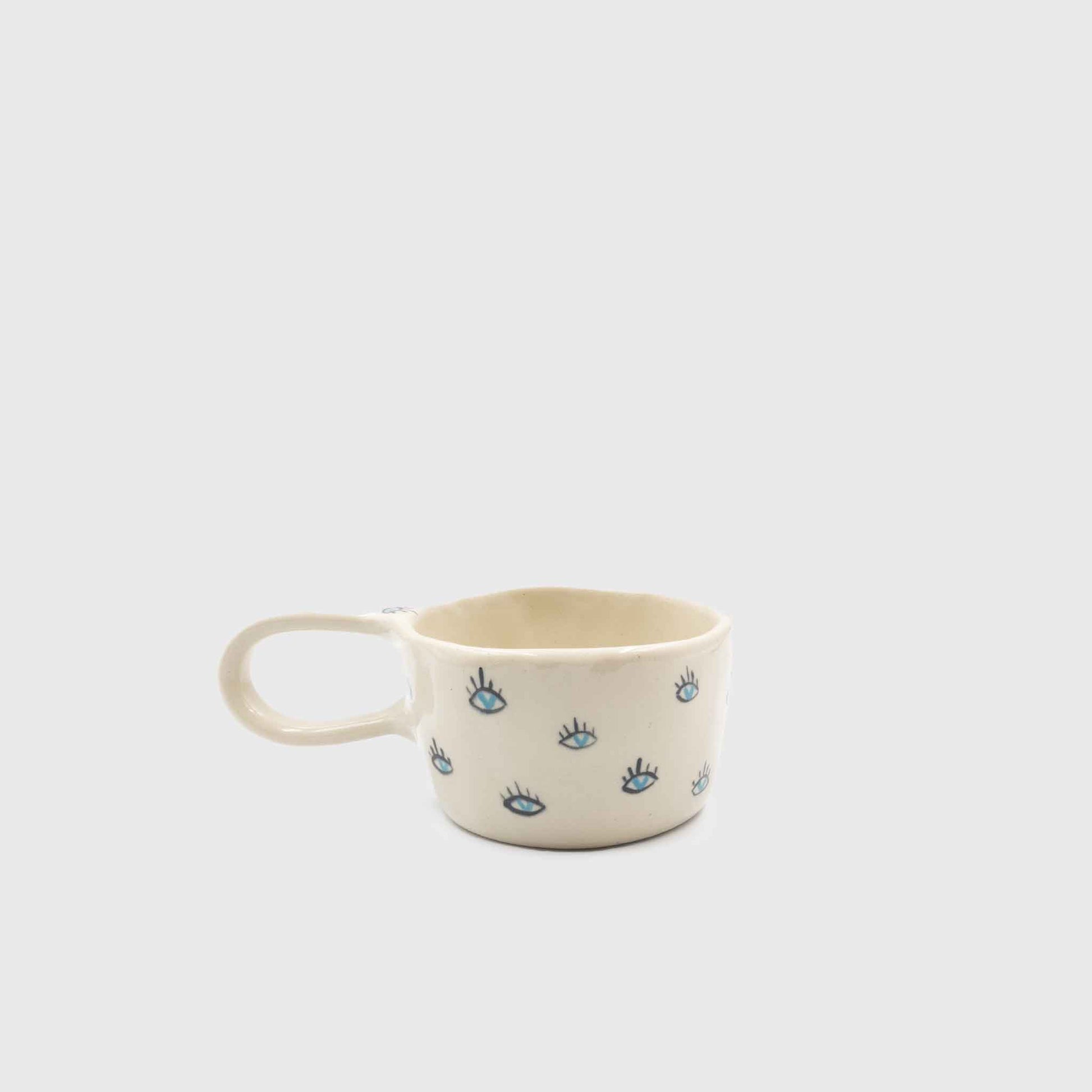 Handmade stoneware mug with ergonomic handle & heart-shaped eyes. Food safe, 250ml, unique design & quality. With an ergonomic handle and a unique design, opened in the hand with love and respect. With heart-shaped eyes to prevent the "evil" "eye". Handmade construction from high quality white "stoneware" clay fired at 1230-1240°C, dishwasher safe.