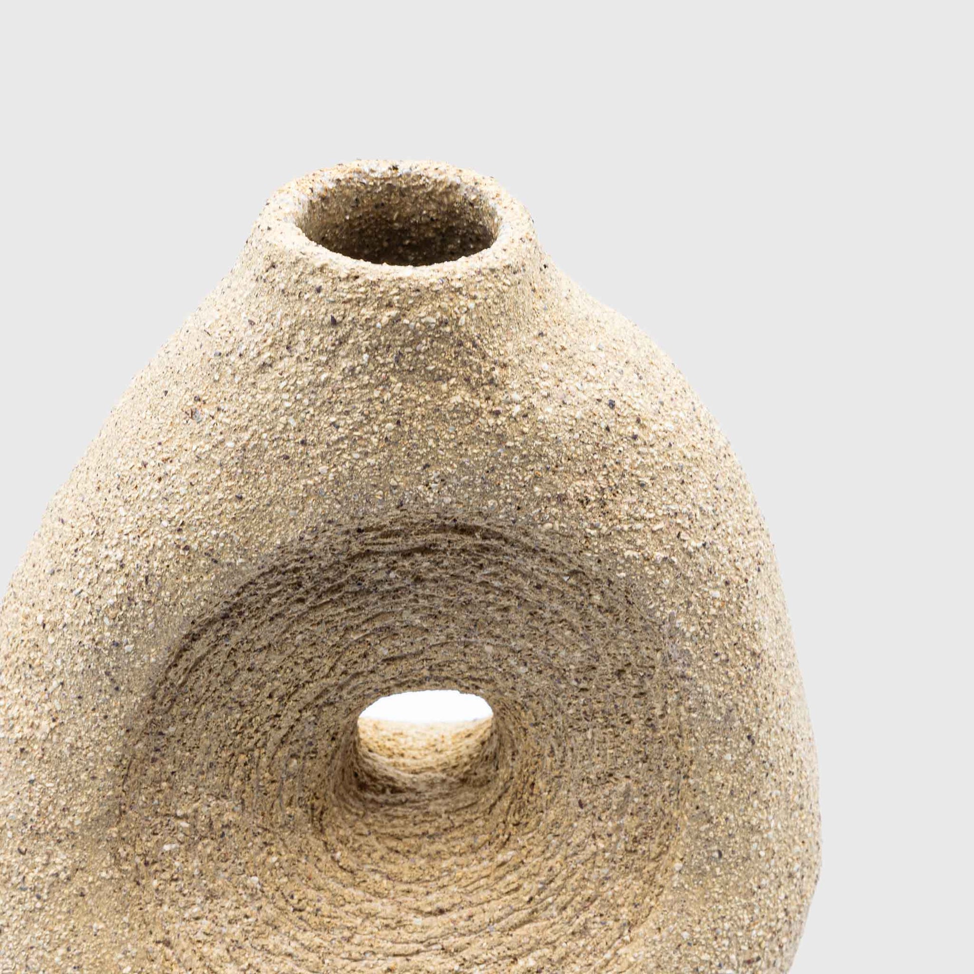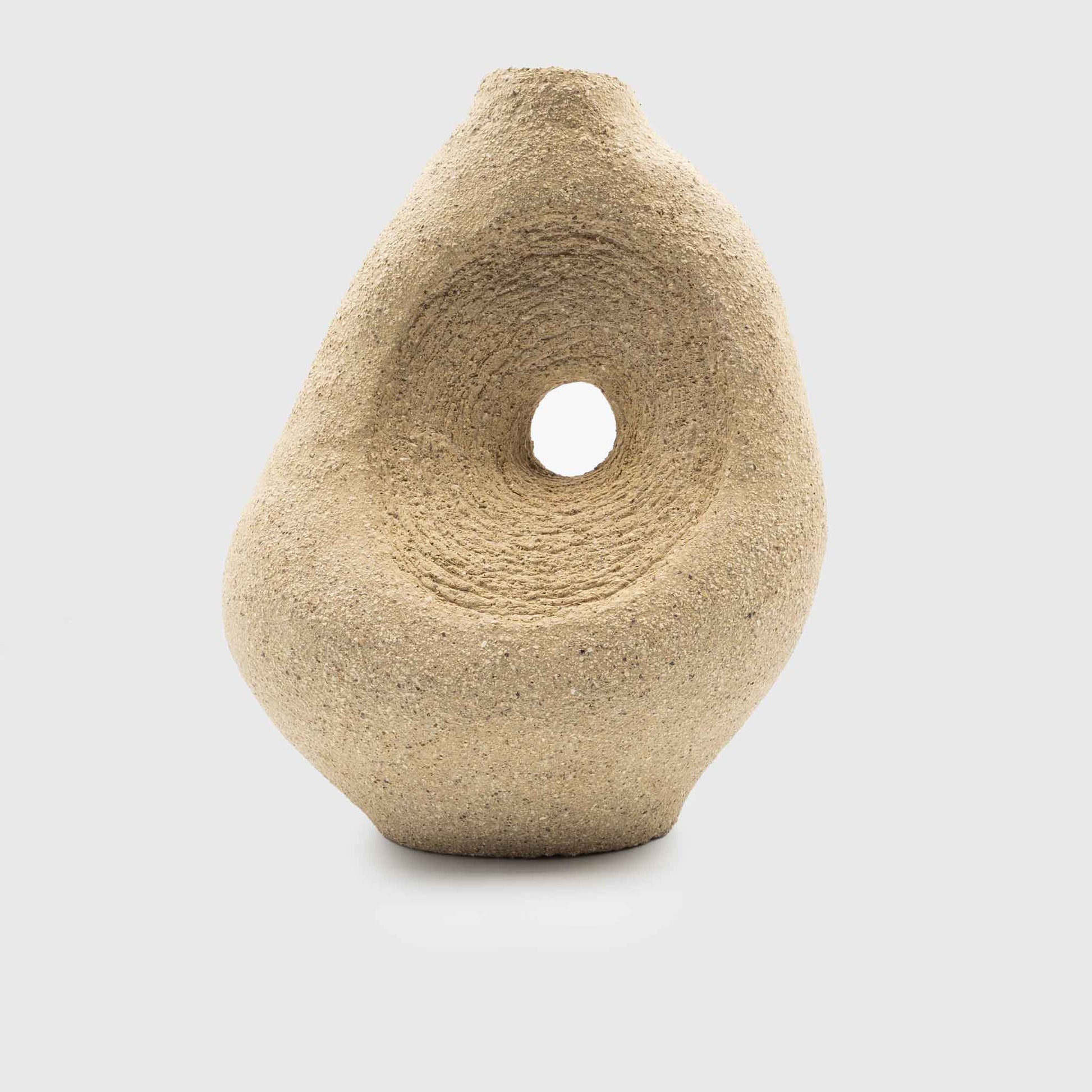 Ceramic sculptural vase formed out of heavy grogged clay to give the rough texture of stone. Glazed inside and fired at 1220 °C to hold water