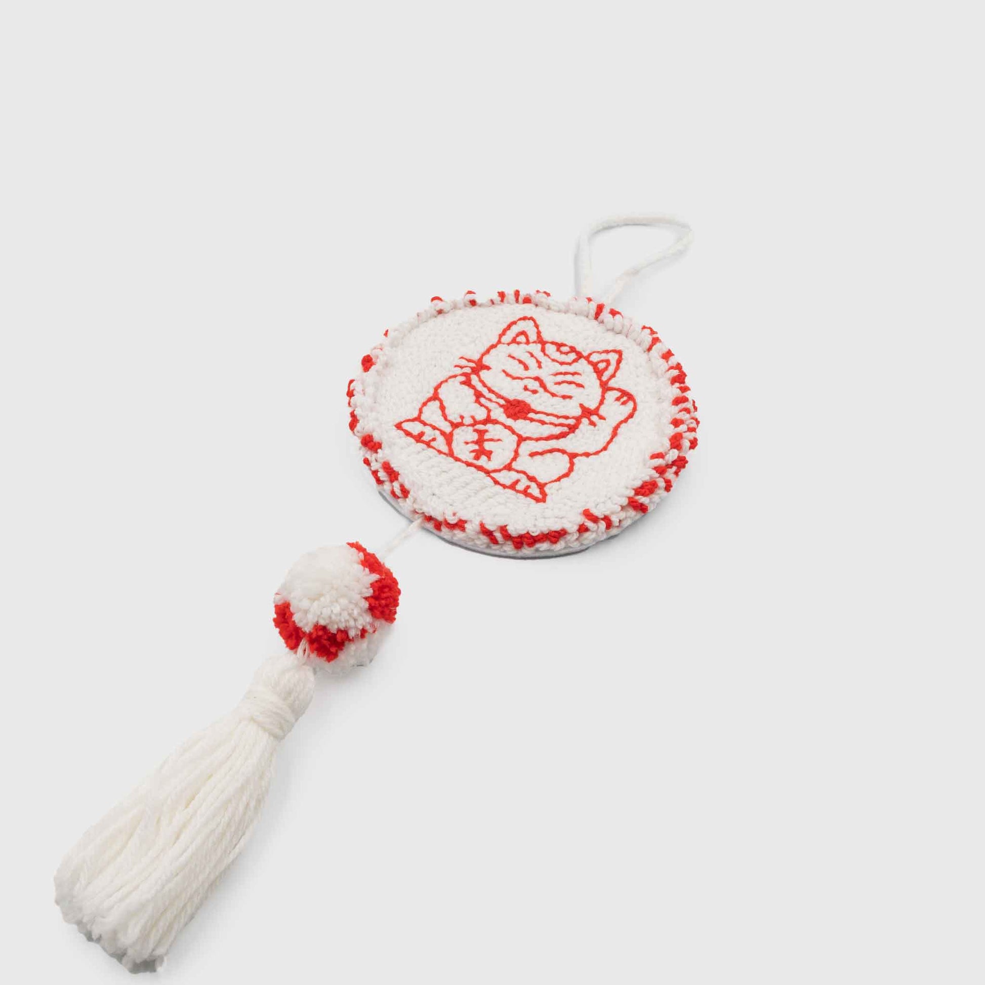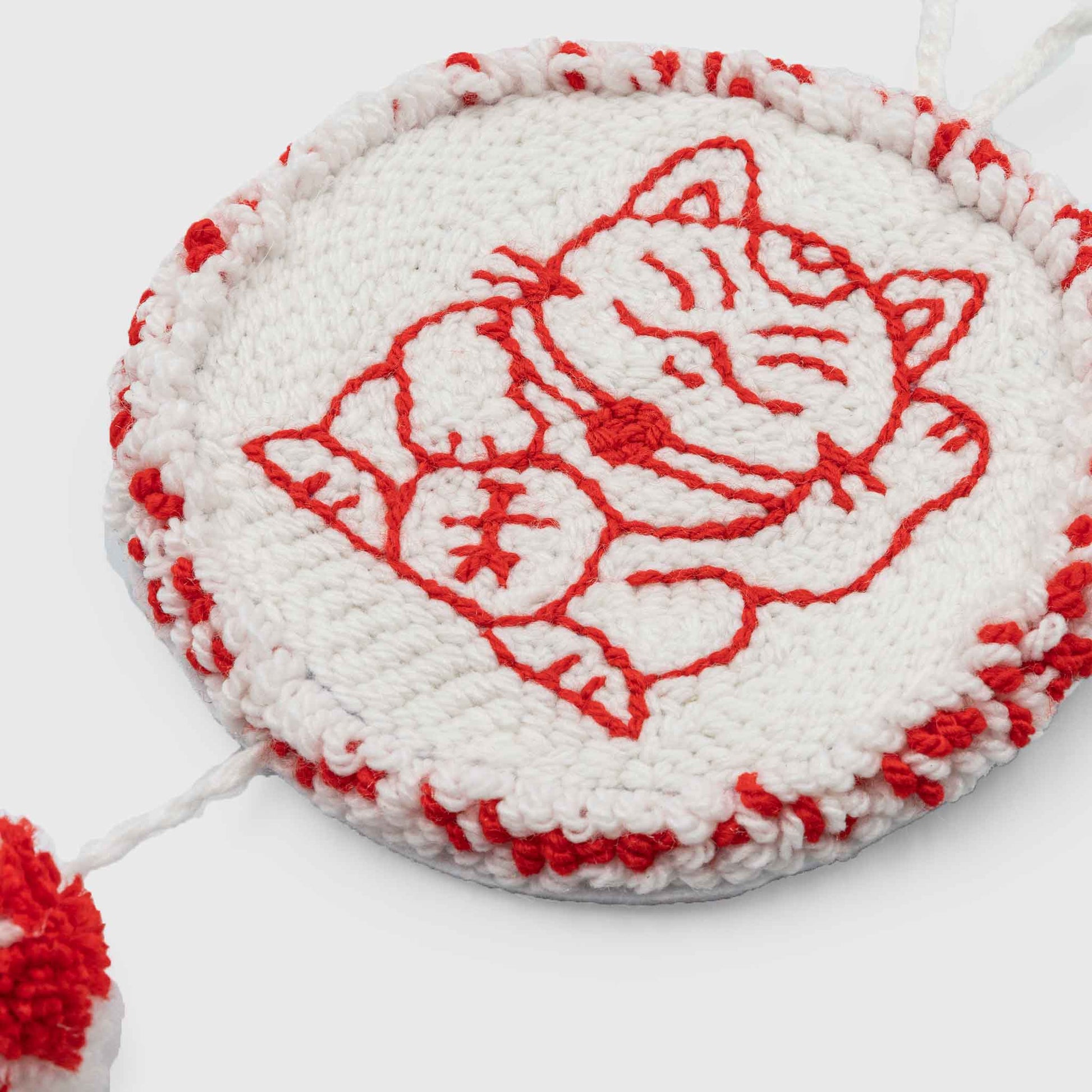 Room decoration, handmade, knitted Maneki-neko or lucky cat is a Japanese cat symbol with the characteristic bell on the neck and the raised left leg. Placing it at the entrance of the house is believed to welcome visitors, bring good luck and financial prosperity. 100% handmade, made of acrylic yarn.