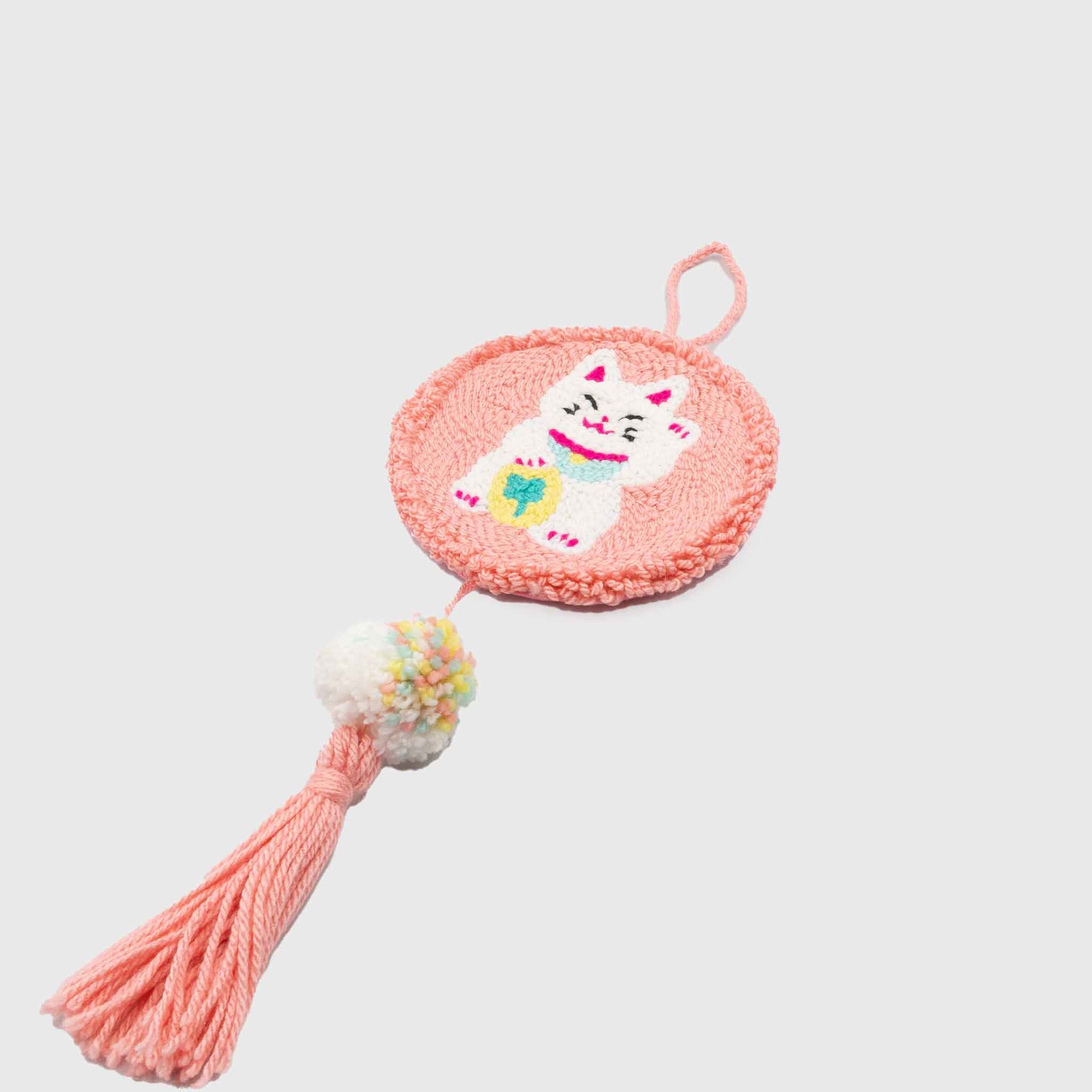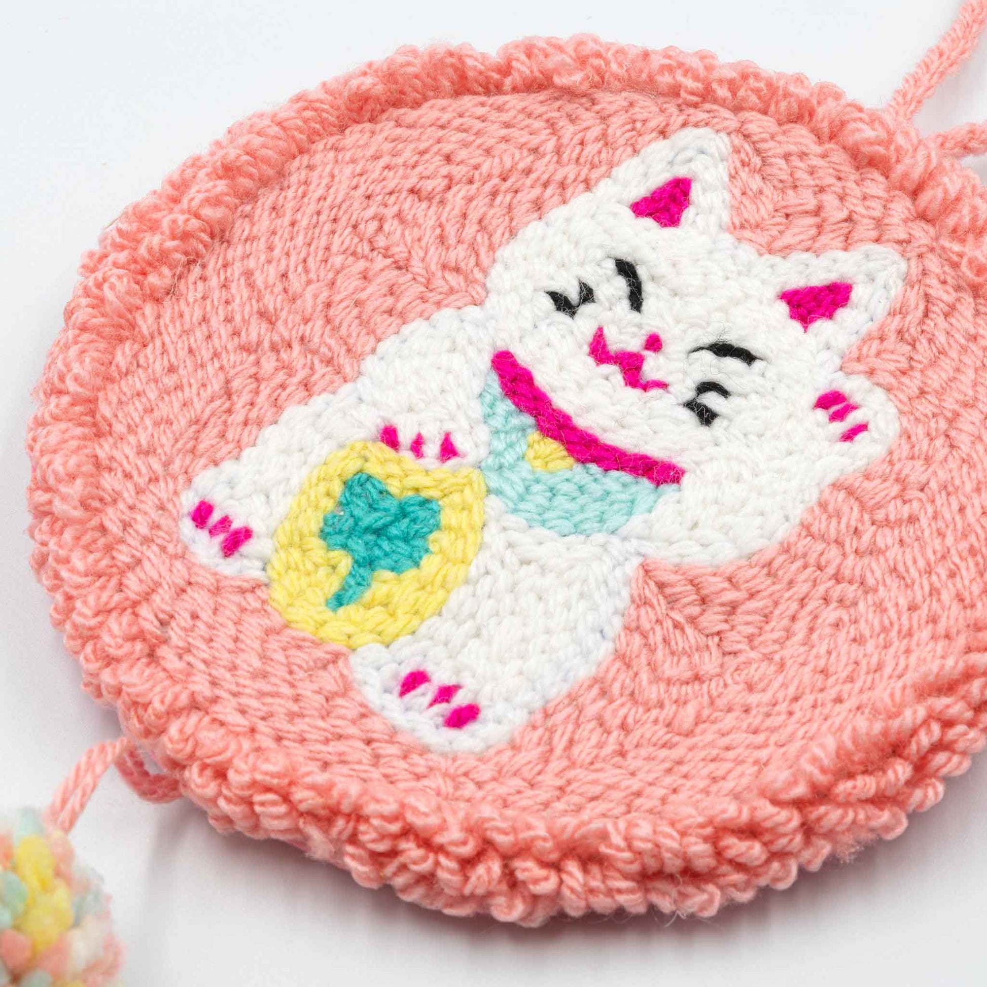 Room decoration, handmade, knitted Maneki-neko or otherwise lucky cat is a Japanese cat symbol with the characteristic bell on the neck and the raised left leg. Placing it at the entrance of the house is believed to augur well for visitors, bring good luck and financial prosperity. 100% handmade, from acrylic thread.