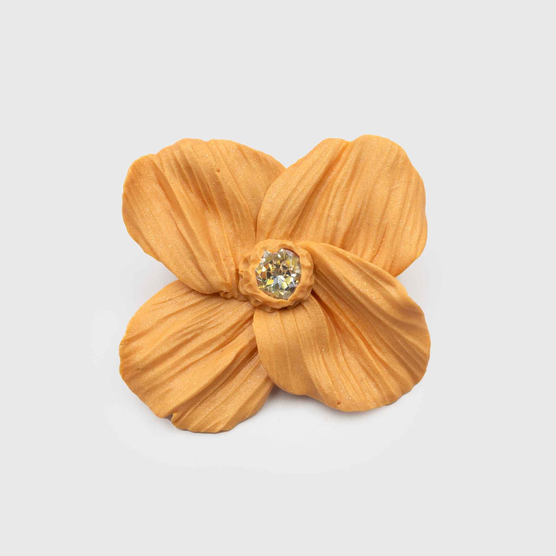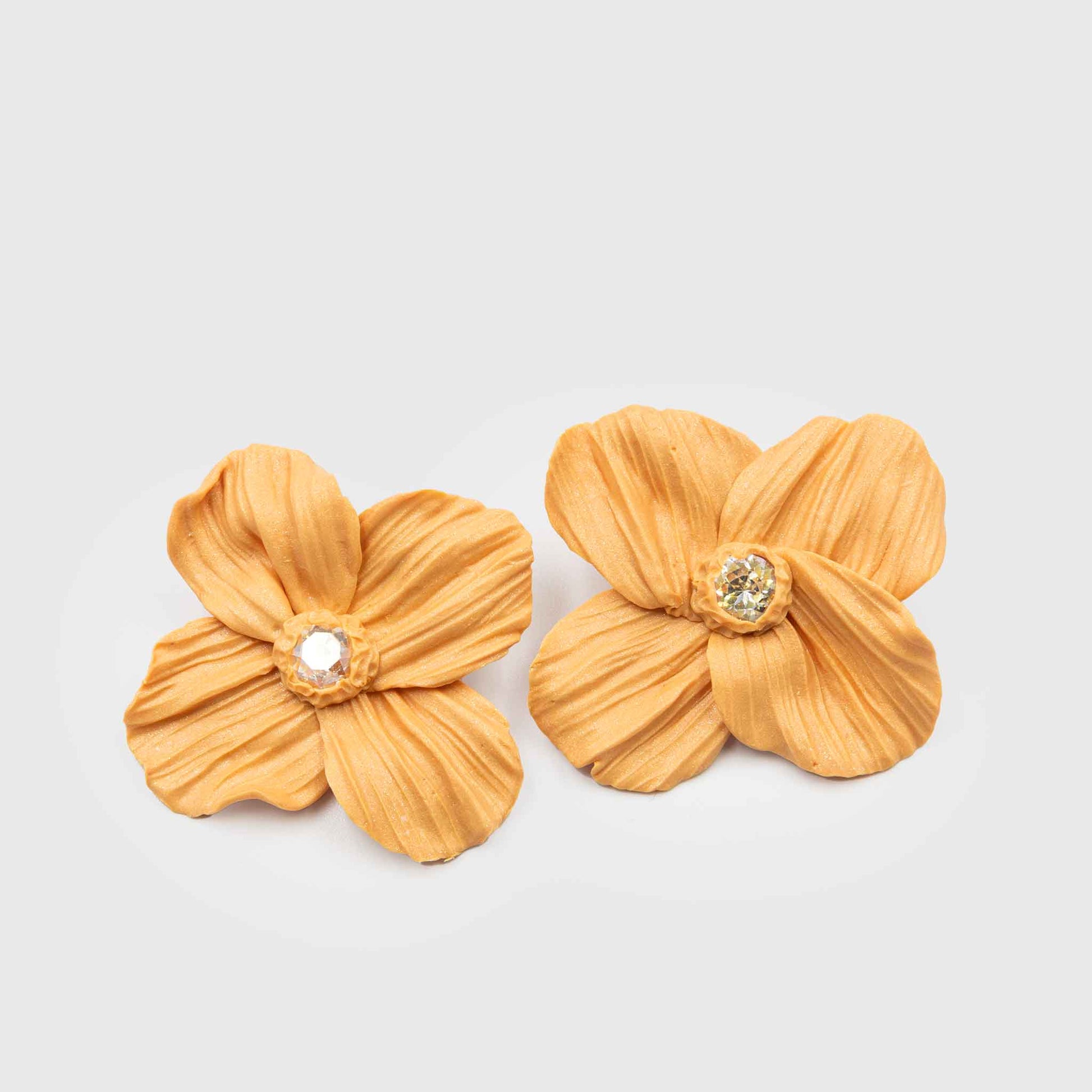 Handmade polymer clay earrings. Light petals with a wavy, embossed texture, like a living leaf, with light glitter. In the center a shiny crystal gives the necessary spark. Light and comfortable stud earrings with stainless steel clasps.