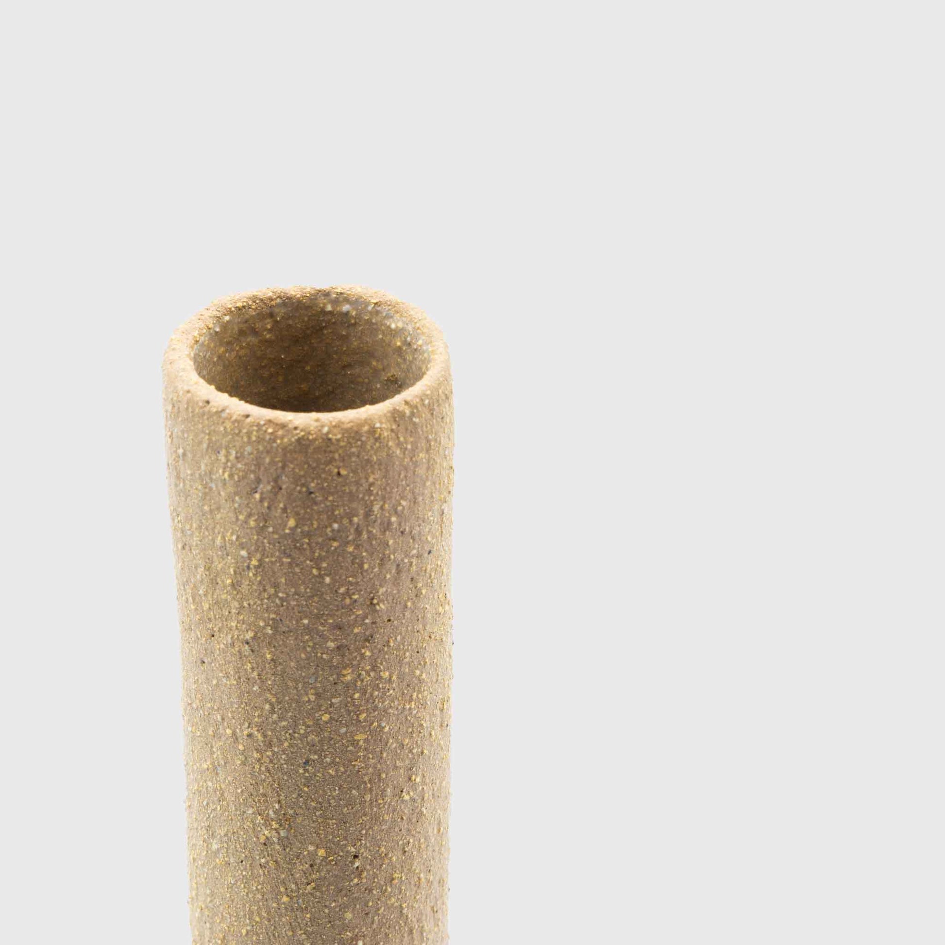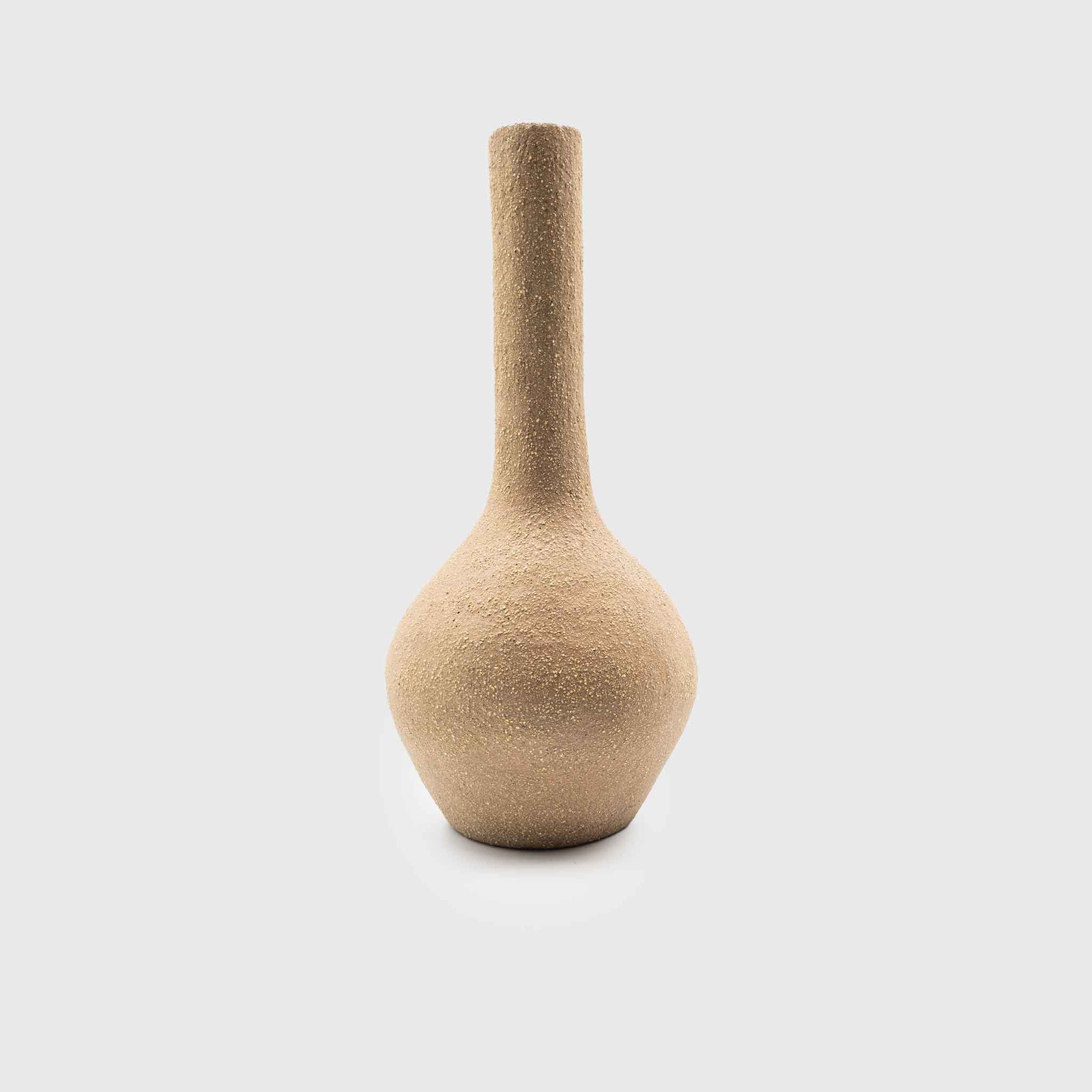 Long neck vase made out of pink stoneware clay. Clear glaze on the inside.