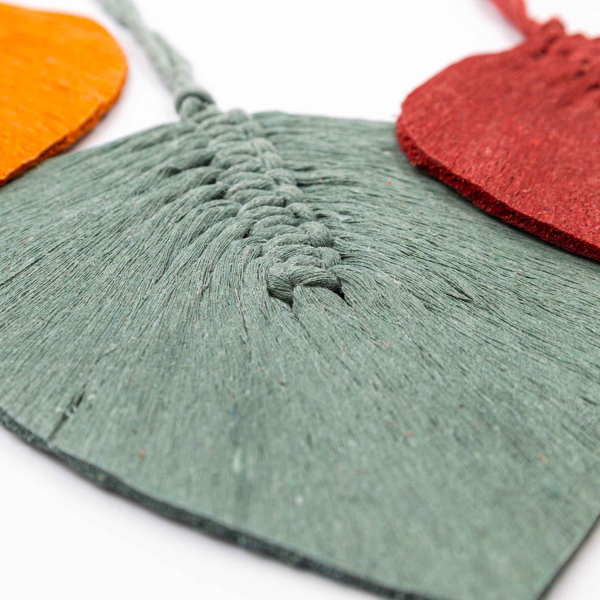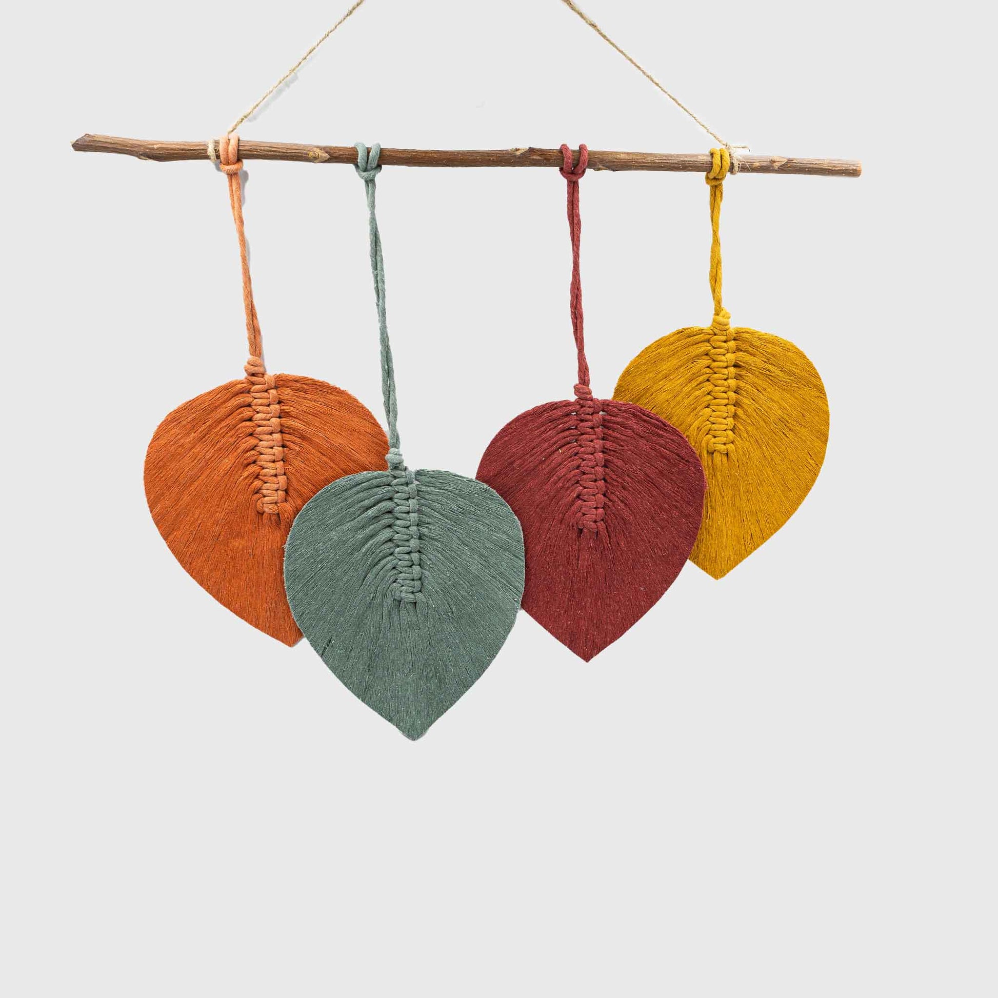 Wall decoration, handmade macrame decorative leaves, hanging on a branch.