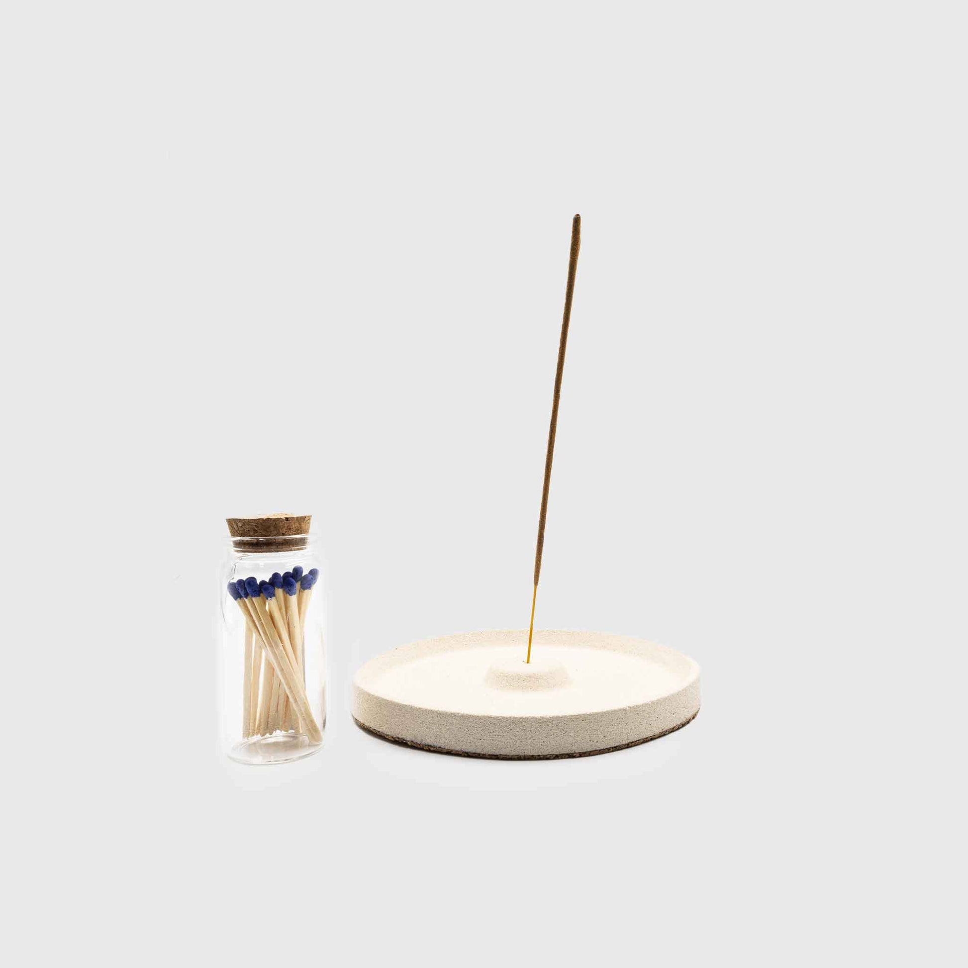 comes with 6 incense sticks made of natural wood powder and essential oil extracts. Handmade, eco-friendly, made from 96% organic ingredients with no toxic or animal by-products. The set is completed with the beautiful glass bottle with cork containing matches.