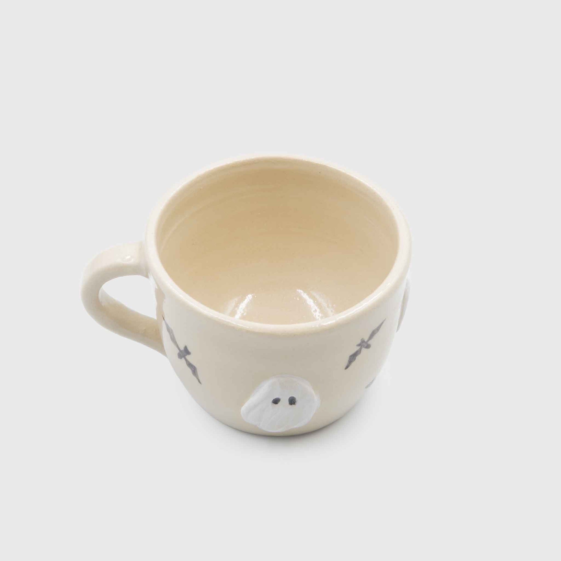 Handmade, ceramic mug, decorated with embossed ghosts and hand-painted bats. Made of high-temperature clay at 1240°, it came to accompany us at all times.