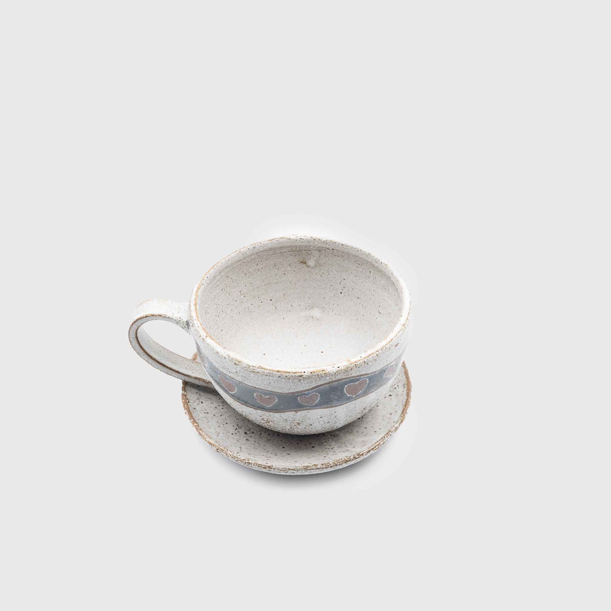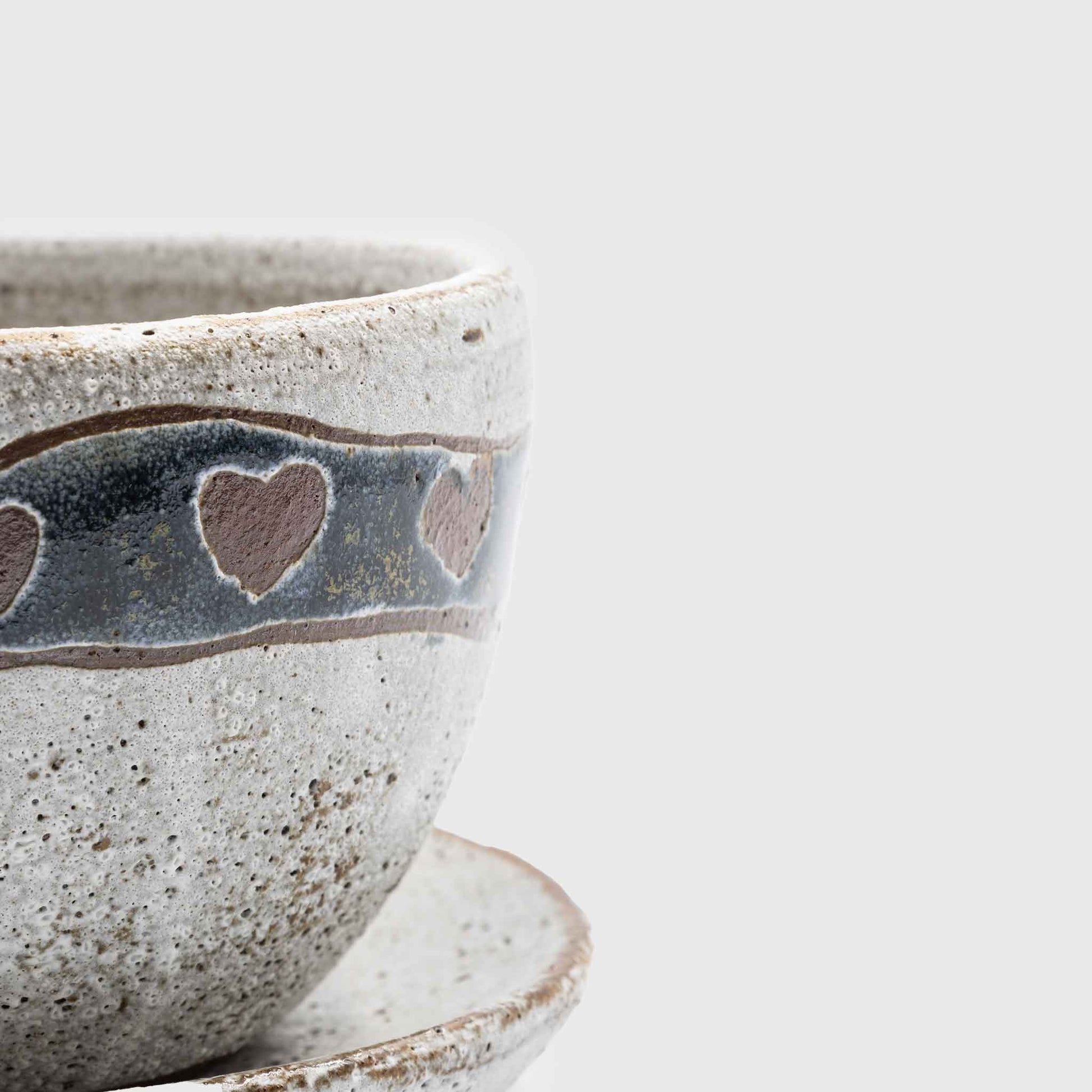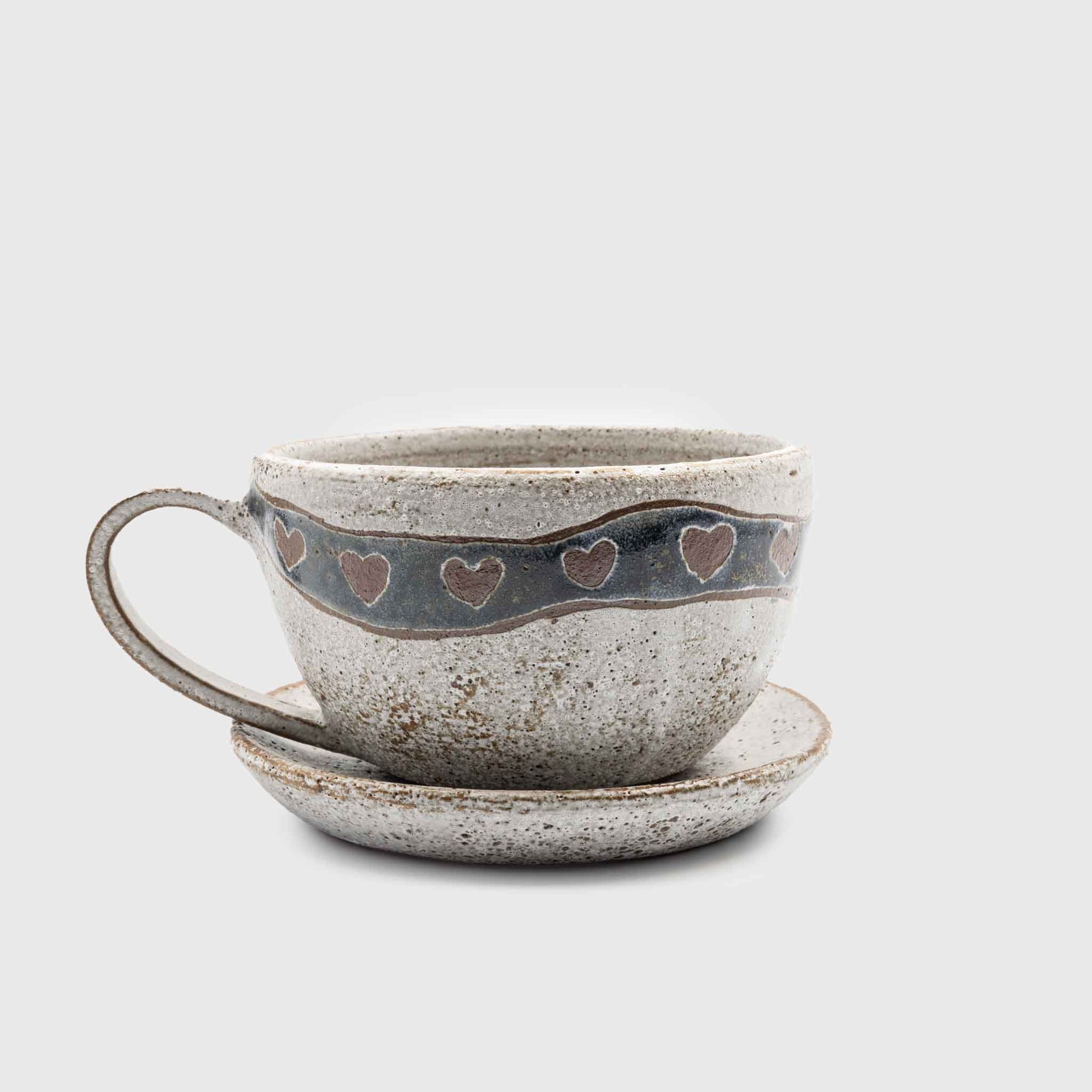 Mug made of high temperature terracotta clay at 1250°, polished in a rustic style, decorated with hearts and with a blue line from local materials.