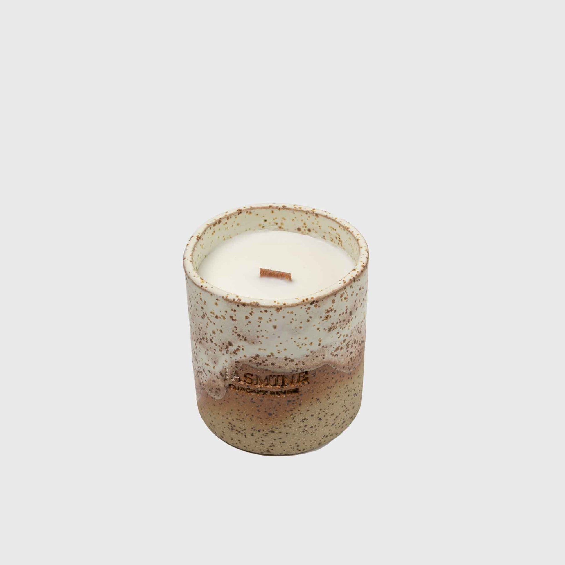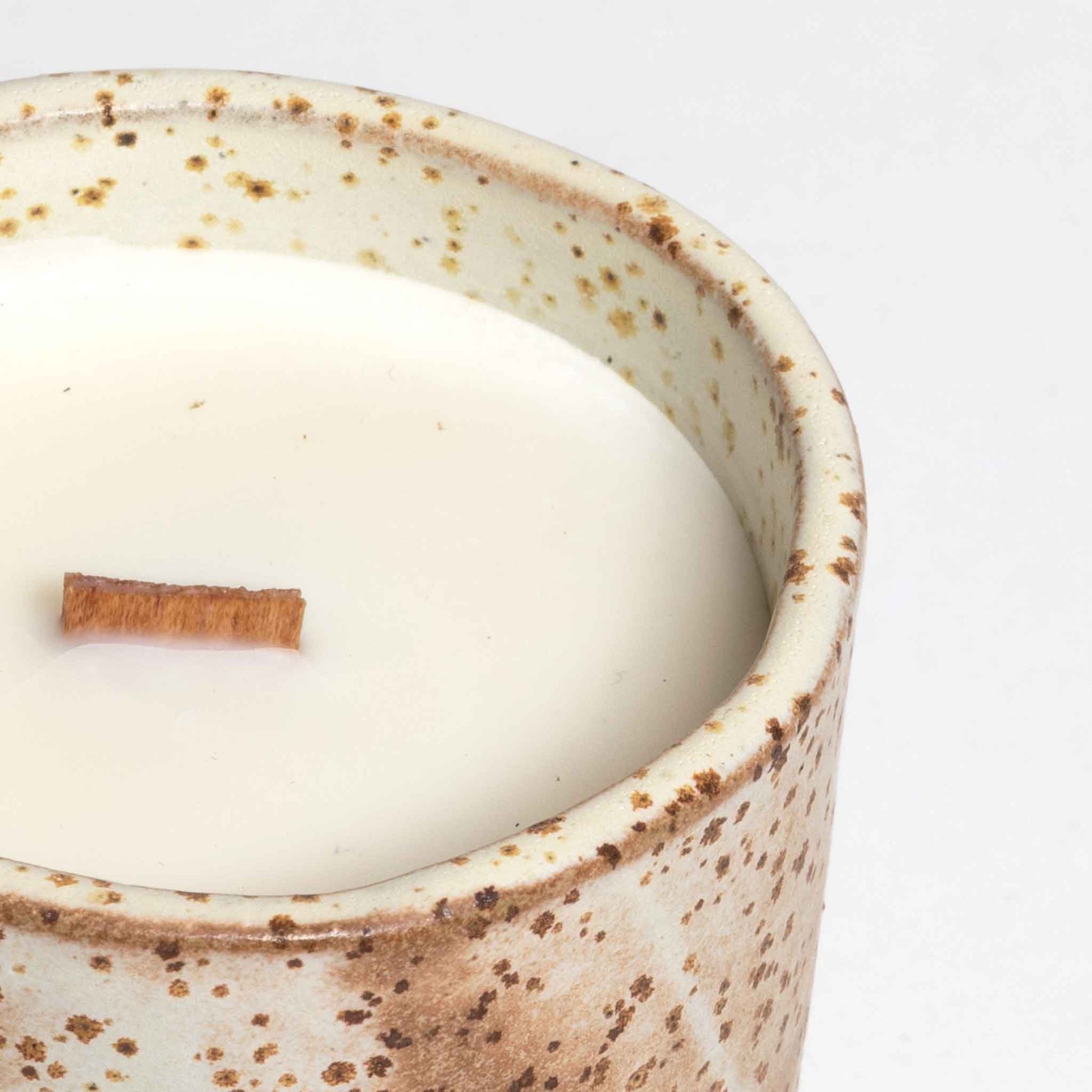 Natural candle made from 100% vegetable soy wax with a wooden wick for unique moments of relaxation. The container is handmade, ceramic of excellent quality and aesthetics, giving the space something unique.