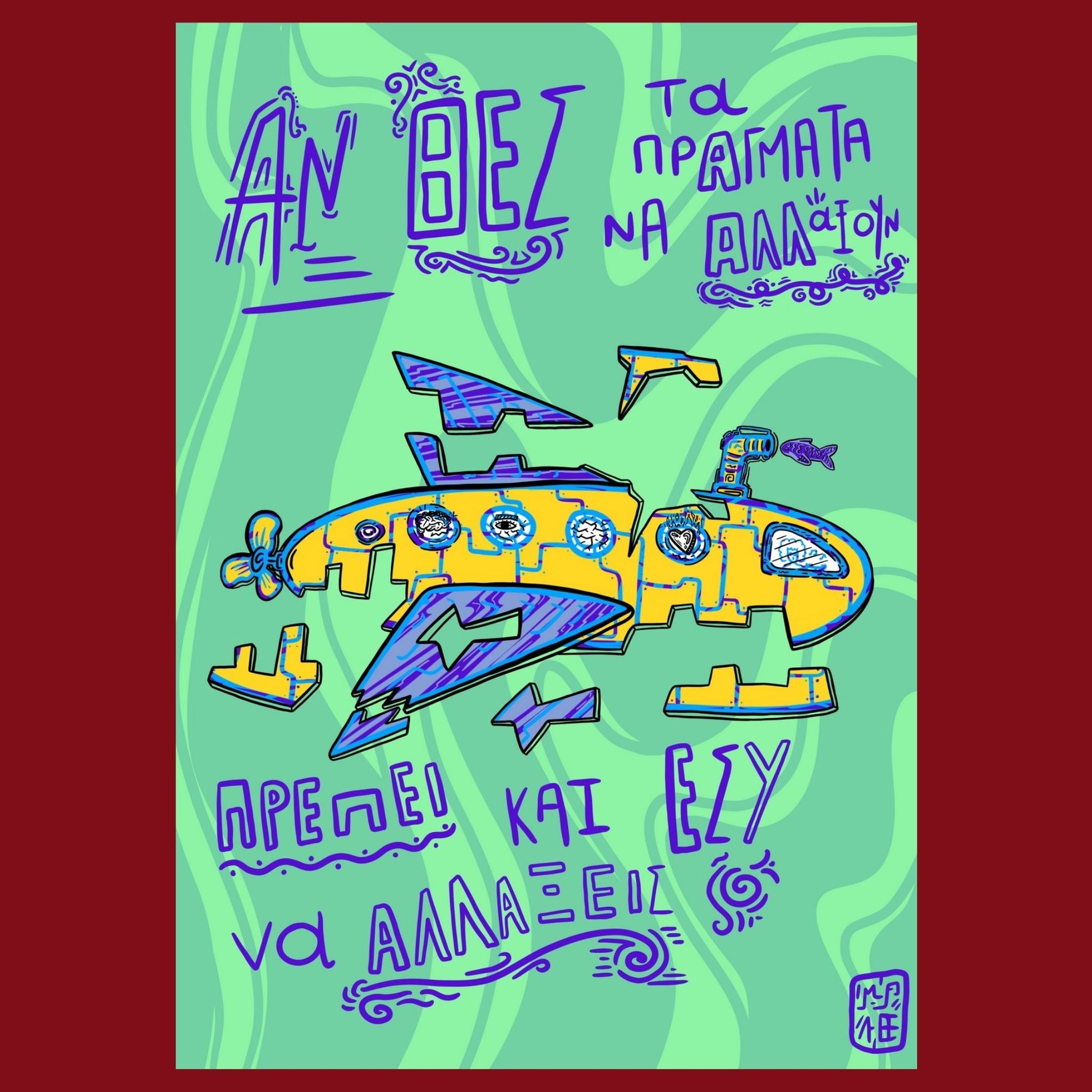 Digital print σε μέγεθος Α4 και χαρτί velvet 300gr. Σχέδιο αποδομημένου υποβρυχίου με quote “αν θέλεις τα πράγματα να αλλάξουν, πρέπει και εσύ να αλλάξεις”.