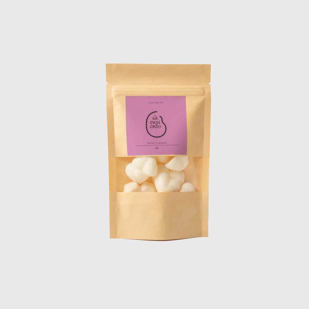 Χειροποίητα Wax Melts Σόγιας με άρωμα Peony & Suede. Ένα εκλεπτυσμένο λουλουδάτο άρωμα, με βελούδινες νότες suede, που προσθέτει κομψότητα σε κάθε χώρο.