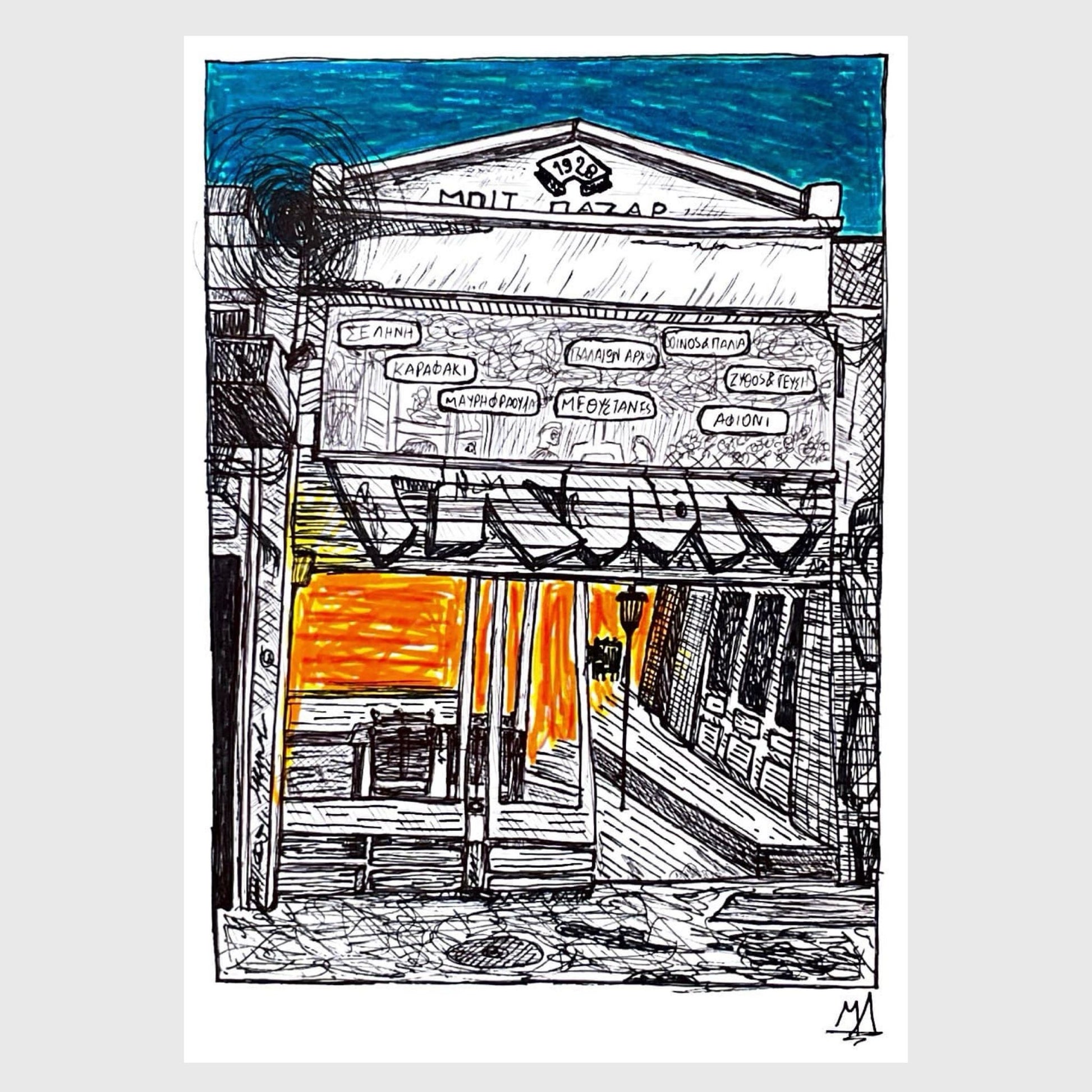 Digital print εκτυπωμένο σε velvet χαρτί 300γρ. από μοναδικά σχέδια αναπαράσταση κτηρίων από διάφορες πόλεις της Ελλάδας ως αποτέλεσμα ενός project. Το συγκεκριμένο είναι από την Θεσσαλονίκη στο Μπιτ Παζάρ. Υπογεγραμμένα από τον καλλιτέχνη.