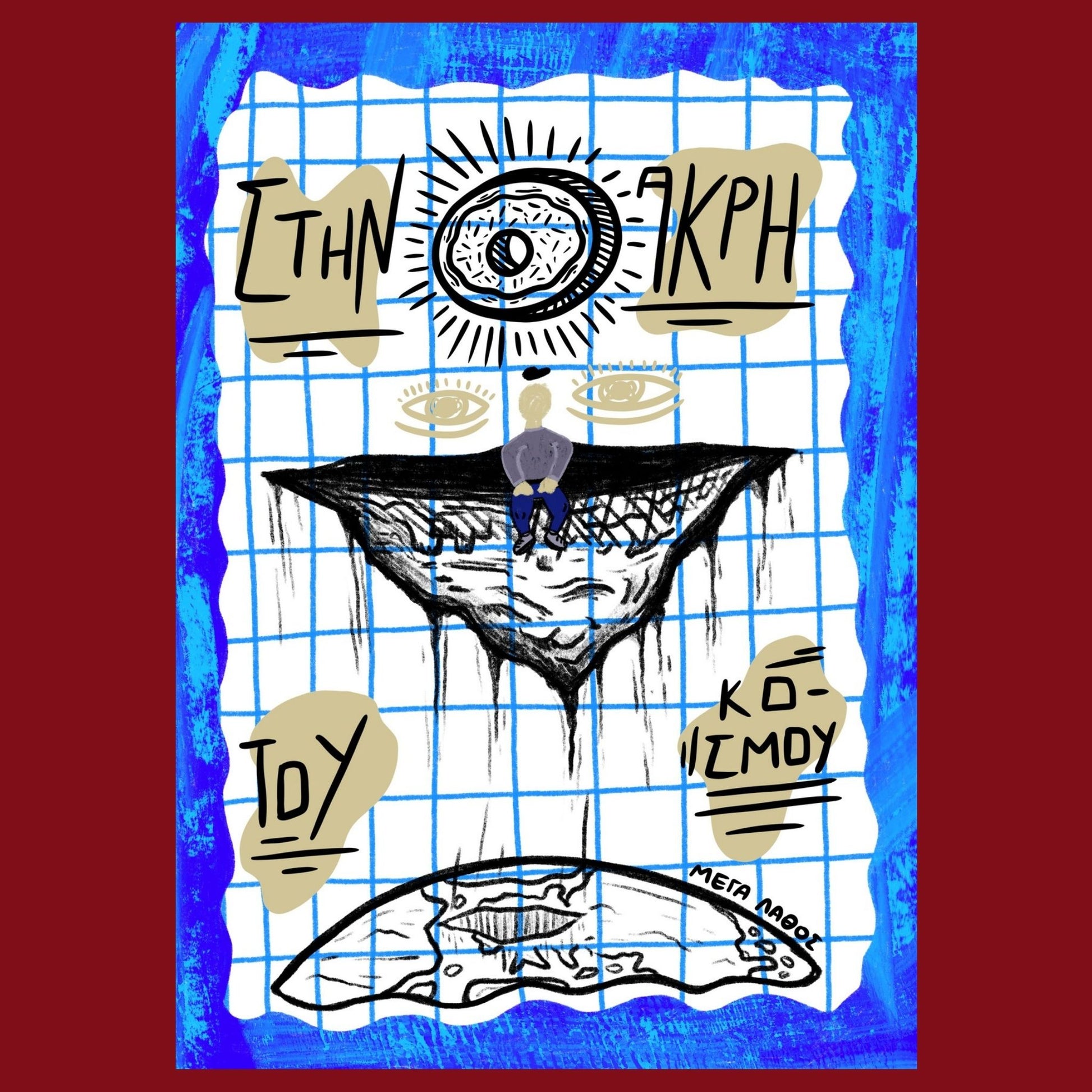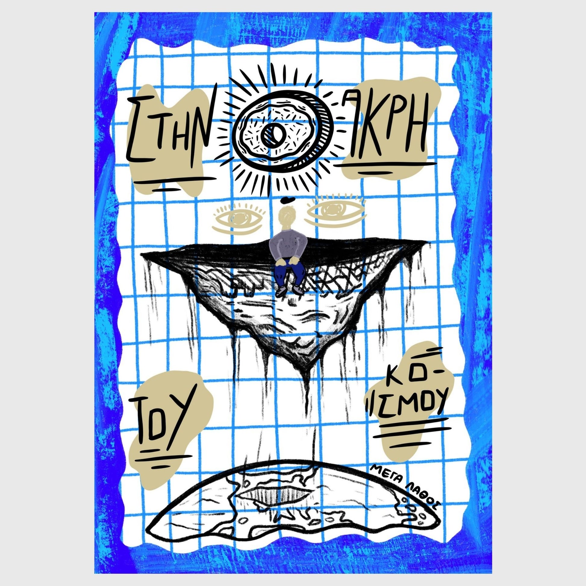 Digital print σε μέγεθος Α4 και χαρτί velvet 300gr. Με σχέδιο ενός ανθρώπου στην άκρη ενός κόσμου. Quote “στην ακρη του κοσμου”.
